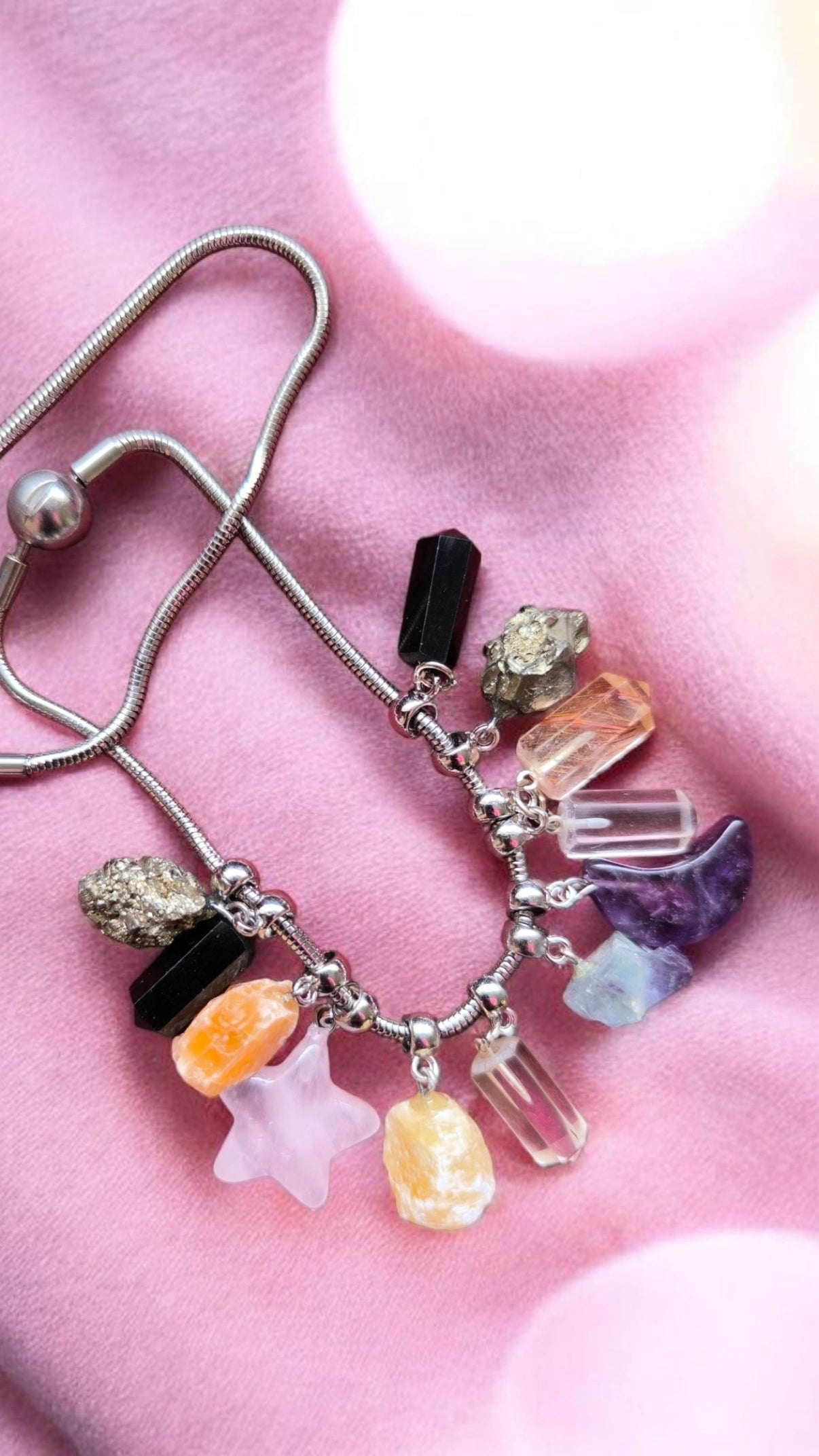 Cada peça é confeccionada com cristais 100% naturais, selecionados intuitivamente para alinhar você à vibração que seu momento pede — seja prosperidade, amor, clareza, coragem ou proteção.