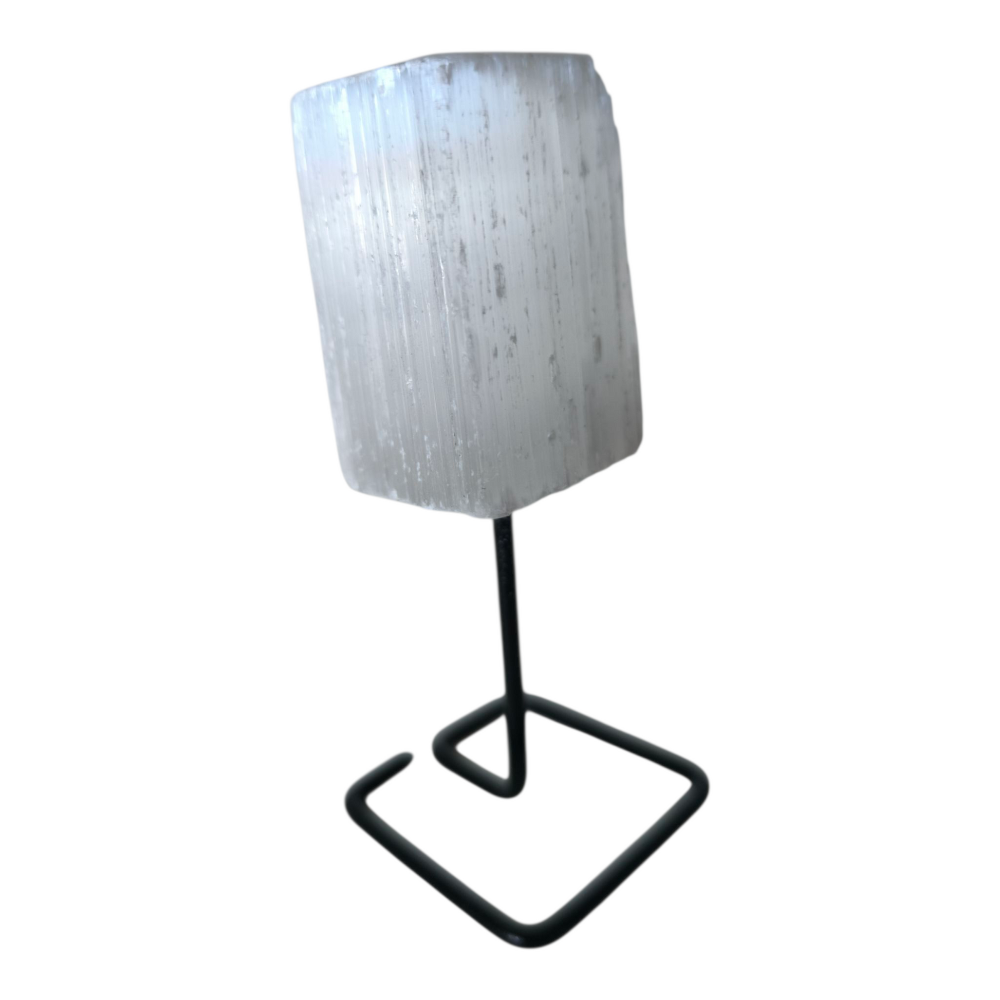 Fixada em base de ferro, essa peça une a energia etérea e suave da Selenita à força e estabilidade do ferro, potencializando ainda mais sua atuação de limpeza, proteção e ancoramento.