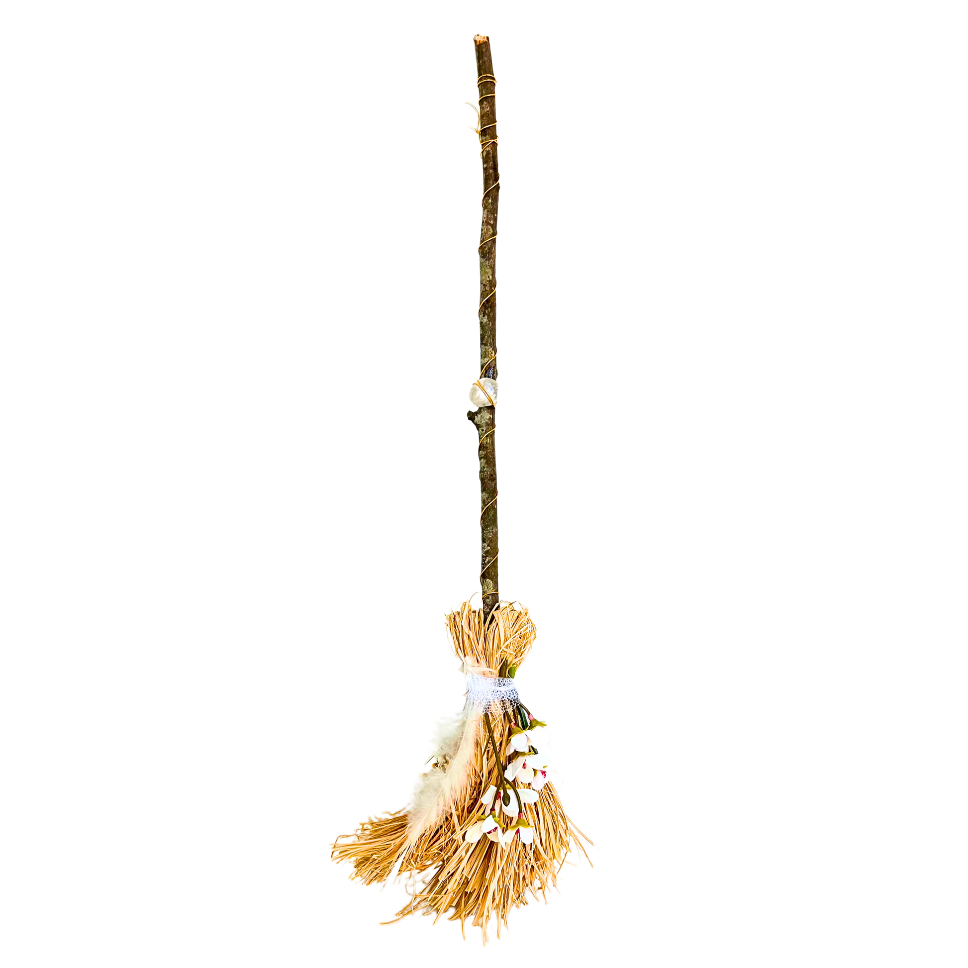 Vassourinhas feitas artesanalmente com palha da costa, penas, fitas, flores e folhas. Cada uma contém um cristal para energizar a limpeza ritualística.